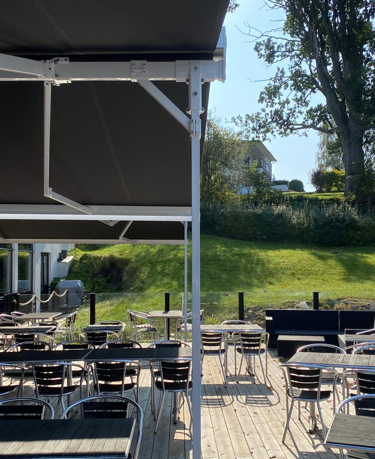 Dubbelmarkis Helmer är en stabil, flexibel och smidig lösning av solskydd som bildar en plats likt ett uterum.