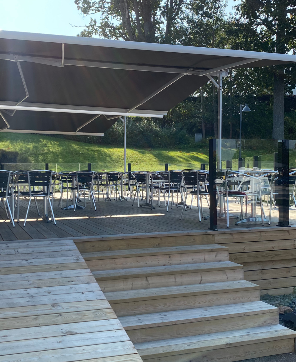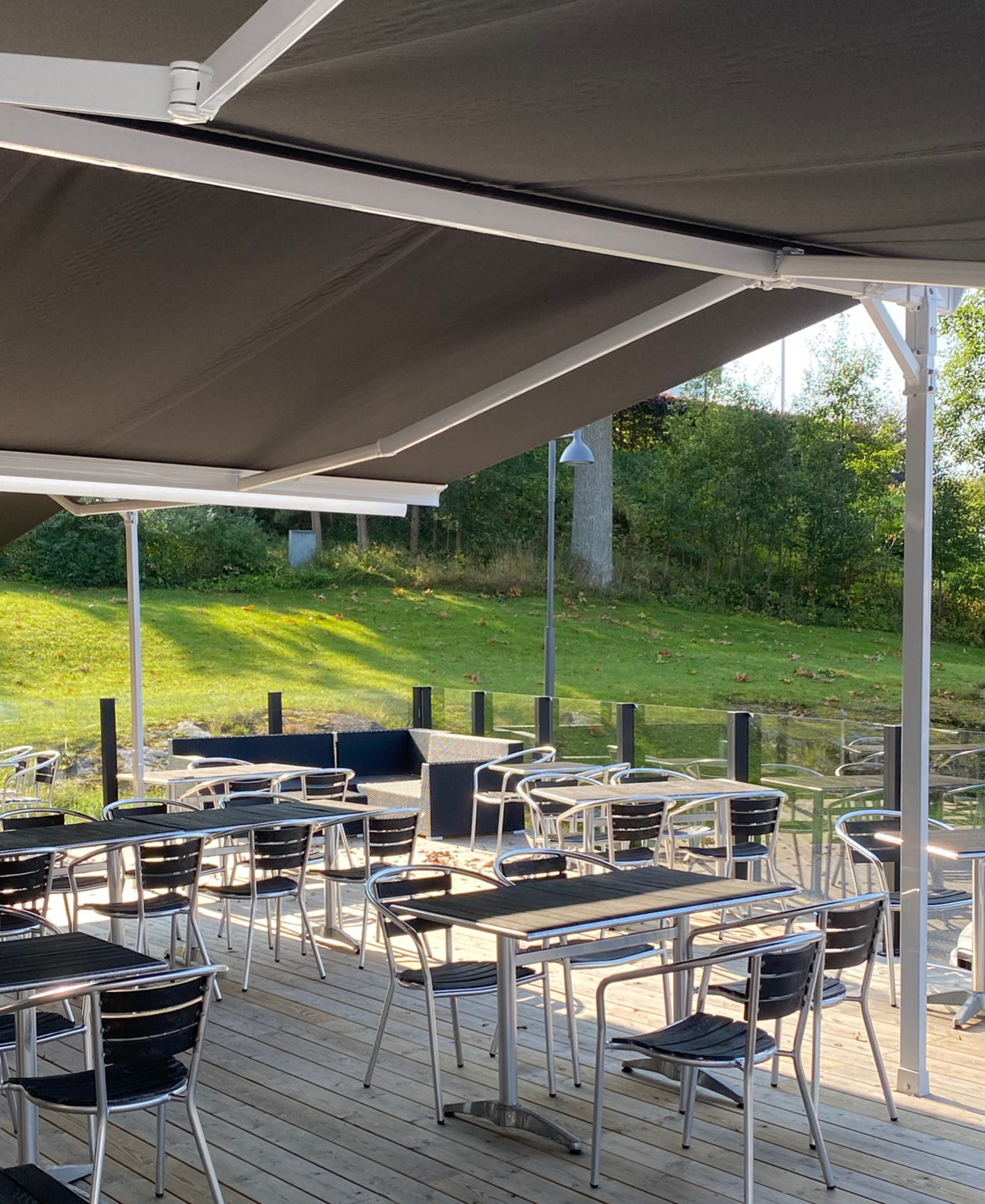 Dubbelmarkis Helmer är en stabil, flexibel och smidig lösning av solskydd som bildar en plats likt ett uterum.